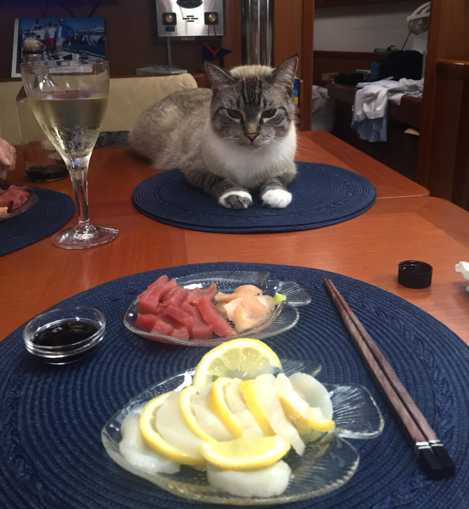 One of the good things about having a cat aboard rather than a dog, is that you don’t have to take the cat ashore. Having said that, Hobie does walk on a leash with a very secure harness. Cats can be trained to walk on a leash and I think that Hobie realizes it’s one way he can get off the boat. If this is something that you think you would like to do with your cat, begin their training process before you start your cruising lifestyle.