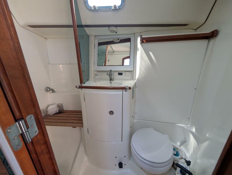 - Dinette with curved settee located to starboard, forward of head. Table lowers to create extra double berth, or raises out of the way to create open seating across the salon