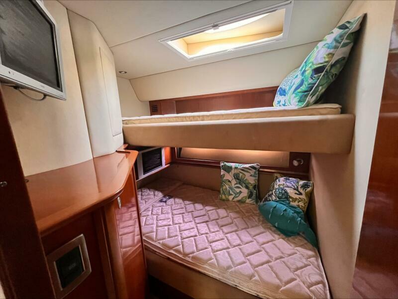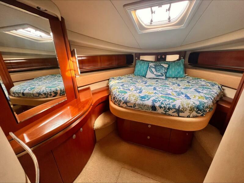 Entering the lower cabin down teak treads to a large, open, fully carpeted salon. The satin cherry cabinetry gives nice warmth to the area. A three person leather sofa lines the rear wall while a two person leather pull out sofa is to starboard. The washer/dryer combo is hidden in a rear wall cabinet. A hi/low cocktail/dining table with two pull-out stools, port side bar space and entertainment center. The galley is along the starboard side just forward of the salon, well equipped with new refrigerator, new freezer, ample upper and lower storage and room to move around. Located across from the galley is a guest room with twin bunks, cedar lined hanging locker, storage drawers and guest head with separate stall shower. This is also the day head with access from the hallway as well as the guest room. The master stateroom is forward with a queen size island berth with drawer space beneath, built in night stands, dressing mirror, dual cedar lined hanging lockers, upper and lower storage cabinets and reading lamps. The master head has corian counters, mirrored medicine cabinet, separate stall shower with a built in seat.
