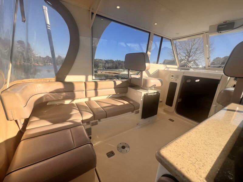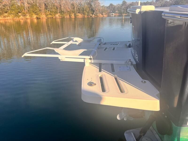 The cockpit features molded seating and storage lockers. The cockpit features a transom door for easy access to the swim platform enhancing its functionality for fishing and family outings.