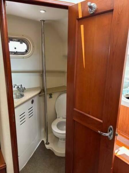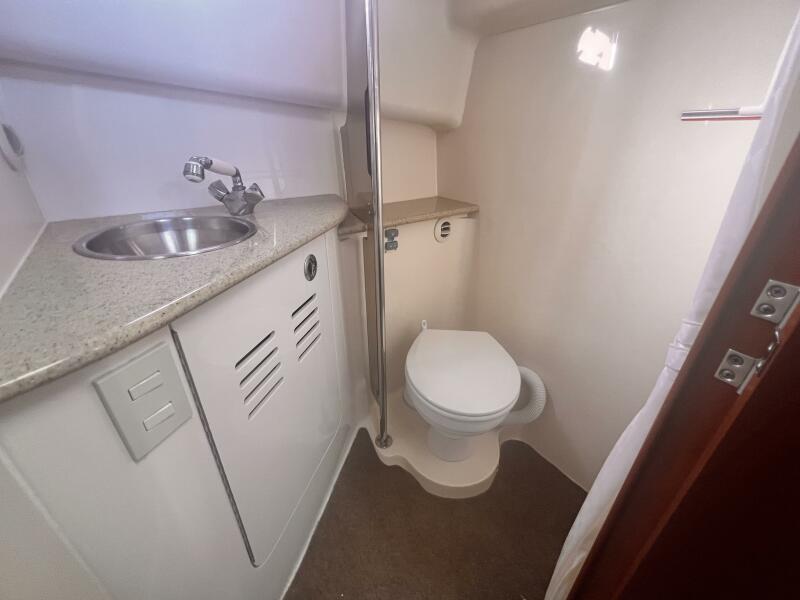Queen berth in forward cabin with a three seat settee that converts into bunk beds. A private head with pull out shower and quiet flush electric toilet is to port.