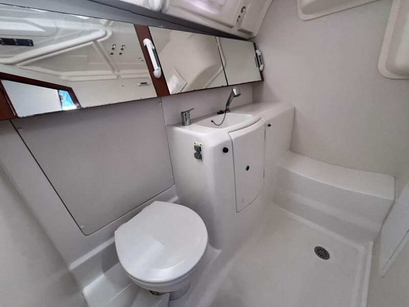 • Head to starboard w/ electric head, vanity & shower area w/ seat