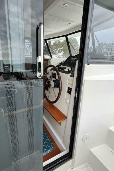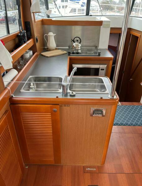 Forward of the salon is the galley, to port and the lower helm, to starboard. The Galley has a Force 10 2-burner propane cooktop and microwave as well as sink & fridge. The helm has a double seat with fold-out foot rest. Wheel and dashboard with all the instruments are easily visible and accessible as is the starboard side deck, from the sliding door.