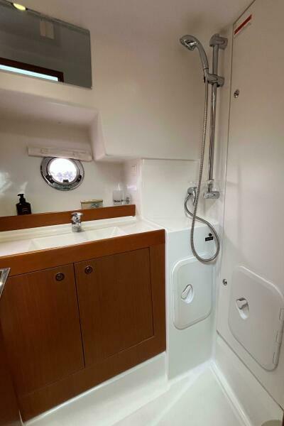 Step down between the galley and helm to the sleeping quarters and head. The head is to starboard, guest cabin with single bunk beds and storage is to port and the master cabin is in the bow. The forward cabin has large storage closets port and starboard, a very large, comfortable V-berth with shelves down either side.