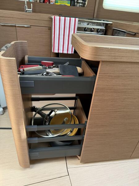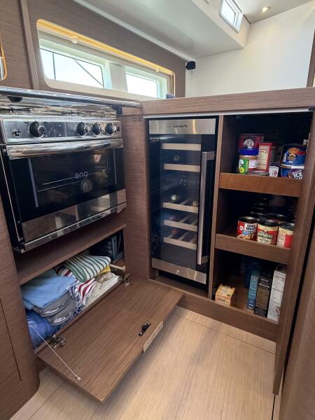 The plum bow and beam which is carried all the way aft create a long waterline and a stable hull which performs well in all weather conditions thanks to twin rudders.